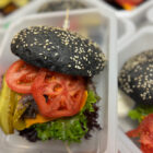 OBIAD – Wegański burger z wegańskim serem cheddar, piklami, pomidorem malinowym i konfiturą z czerwonej cebuli + wegański majonez truflowy